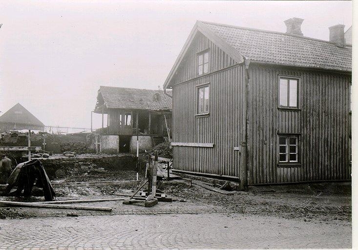Gyllensvans och f.d. Klangagården. Gyllensvans tomt, där ett bostadshus skall uppföras. Husen till höger skall rivas. Foto taget från Parkgatan.