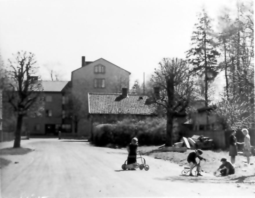 "Det unga Falköping" Frejagatan och barnsjukhuset. Till höger skräddare Helanders hus som inrymde Anderssons radio. Från utställningen "Falköping i bild" 1952.
