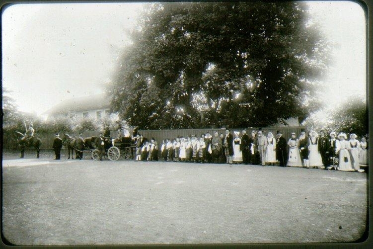 Planteringsförbundets första sommarfest. Deltagande i bröllopståget är från vänster till höger räknat: Stående vid vagnen festarrangörer: A.D. Andersson (Ade), 1:ste stationsskrivare vid SJ. Brudgummen: Carl Lagergren, stationsskrivare vid SJ. Bruden: professor och generaldir. Ivar Tengbom. Spelemän: banktjänsteman Hjalmar Lundin och kontorist Arvid Jakobson. Prästen: Ernst Edström, stationsskrivare vid SJ. Prostinnan: Fröken Hulda Hennerberg. Fröken Ruth Bergqvist, Disponent Oskar Nilsson, bryggeriet Viktoria, Fröken Anna Rehn, gift Elgh. Länsman: Sigurd Johansson, manufakturhandlande, obekant dam, Nils Johansson, specerihandlande, Fröken Josefine, gift Settergren, Borås, Paul Elg, Handelsresande, obekant dam, Hjalmar Lundbladh, kassör, bryggeriet Viktoria, Fröken Hildur Petersson-Nyborg, Karl Jansson, ingenjör, Fröken Ellen Uggla, gift Johansson, Nanny Janzon, gift Tegnér, Hilma Ericsson, gift Forsberg, Elin Jakobsson, gift Erlandsson, Sigrid Jakobsson, gift Lundin, Edith Andersson, bokhållare i Sparbanken
