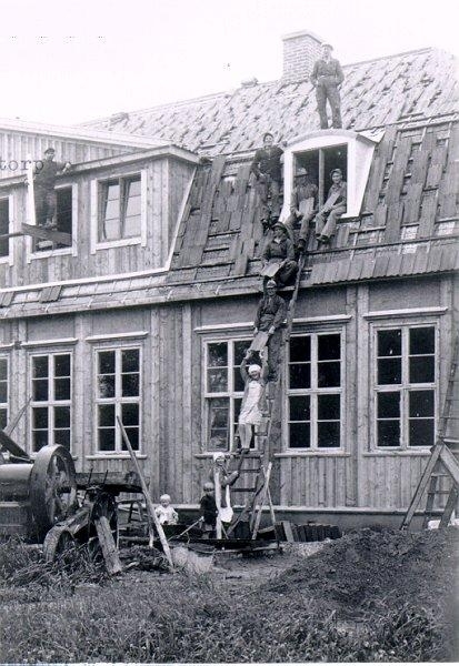 Karleby södra skola, 1930. Övert på takkupan: Karl Fransson, (Marka) Falköping.Till vänster om takkupan: Nils Fransson (Marka) Falköping.Till vänster i fönstret: Anders Gustavsson (Kungslena) Stenstorp.Till höger i fönstret: Harald Thor, Marka, Falköping.Uppifrån på stegen: Gustav Gustavsson, Kungslena, Falköping. Erik Thor, Marka, Falköping, Margit Axelsson, Uddagården, Falköping. På markplanet: Fru Andersson med barnen. Maka till byggmäst. Teodor Andersson, Kungslena, Skövde. På ställningen till vänster: Namn? Plåtmästare, Stenstorp.