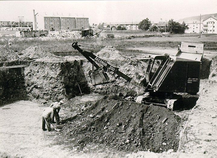 Omkring mitten av 1940-talet började allmänt grävmaskiner användas vid schakt av husgrunder. Grävmaskinen på bilden utför schakt till panncentralen i kvarteret Lien, Wettterlinsgatan 19. Panncentralen betjänar 260 lägenheter i kvarteren Plogen, Harven, Lien och Räfsan med värme och varmvatten. Under ett tunnare lager av matjord var det 3,5 meter djup pinnmo ned till kalk-berget. Ytan ovanpå kalkberget var i allmänhet plan med horisontala och vertikala sprickor. Grävmaskinen lösgjorde och lastade jorden på lastbilar. Två män följde grävmaskinen och skyfflade fram den jord som maskinen inte kunde få med i skopan. Kalkberget borrades sedan och sprängdes ytterligare 3 meter djupare, varefter kalkstensskrotet med grävmaskinen lastades på lastbilar. En del av detta material användes som underlag till vägar och gator. Till vänster på bilden en halv meter under markytan är brädor synliga. De utgjorde skydd över rikskabel från Stockholm och söderut.