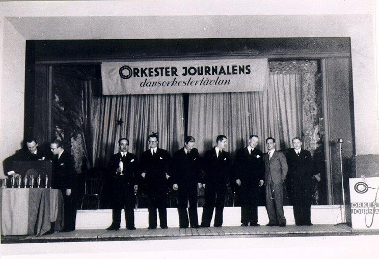 Dansband "Singing Players" från Falköping vinner pris i tidningen Orkesterjournalens dansorkestertävlan omkring 1940. Längst till vänster står tidningens ägare Nils Hellström tillsammans med prisutdelaren Thore Ehrling. Orkestermedlemmarna är från vänster: Gösta Olsson, Gösta Alexandersson, Gunnar Gunnarsson, Gustav Karlsson, Johannes Andersson och Ewert Jönsson.