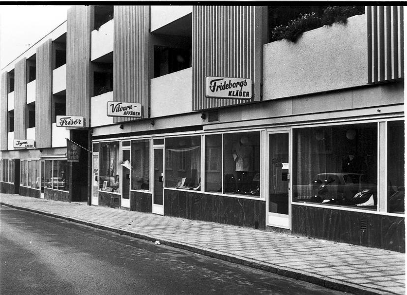 Storgatan 34-36 (S:t Olofs hus). Ingångar till Ingvars lager, frisör, vitvaruaffär och Frideborgs kläder.