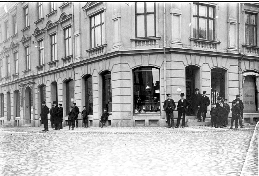 Kv. Guldsmeden. Storgatan 30. "Ljungkvistska huset" Norders hörna. Parti av S:t Olofsgatan och Storgatan med G.W. Lundins Bokhandel 1906. Bokhandelsmedhjälparen Oskar Lundahl stående innerst på trappan.