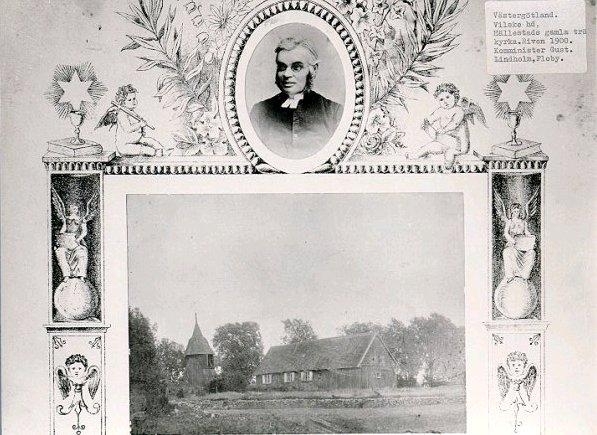 Hällestads gamla träkyrka riven 1900, och komminister G. Lindholm.