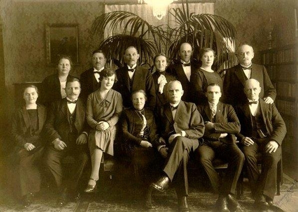 Släkten Hallenius. Nedre raden fr. höger: Adolf Hallenius, Jerker Hallenius (son till Karl och Sandra Hallenius), Alfred och Augusta Hallenius, Viola Hallenius (dotter till Karl och Sandra Hallenius), Sigfrid och Helga Hallenius. Övre raden fr. höger: Viktor och Emmy Hallenius, Fridolf Hallenius (son till Adolf Hallenius), Sandra och Karl Hallenius, Oskar och Anna Sandberg, född Hallenius.