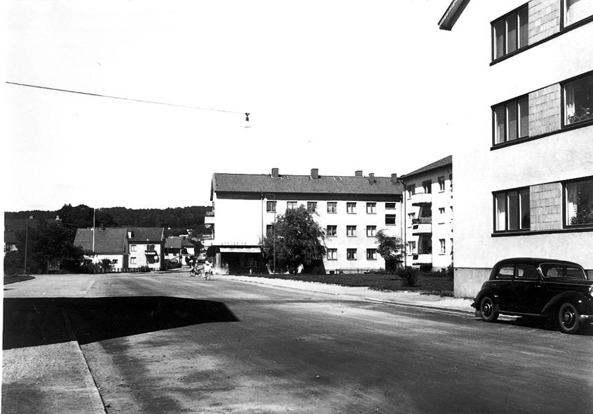S:t Sigfridsplatsen från Wetterlinsgatan. 1951 inköptes konstverket Fiskarna. Gatorna skulle omregleras enl. konstnär Margot Hedemans förslag.