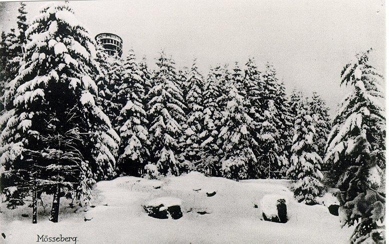 Mösseberg i vinterskrud med utsiktstornet som sticker upp ovanför grantopparna.