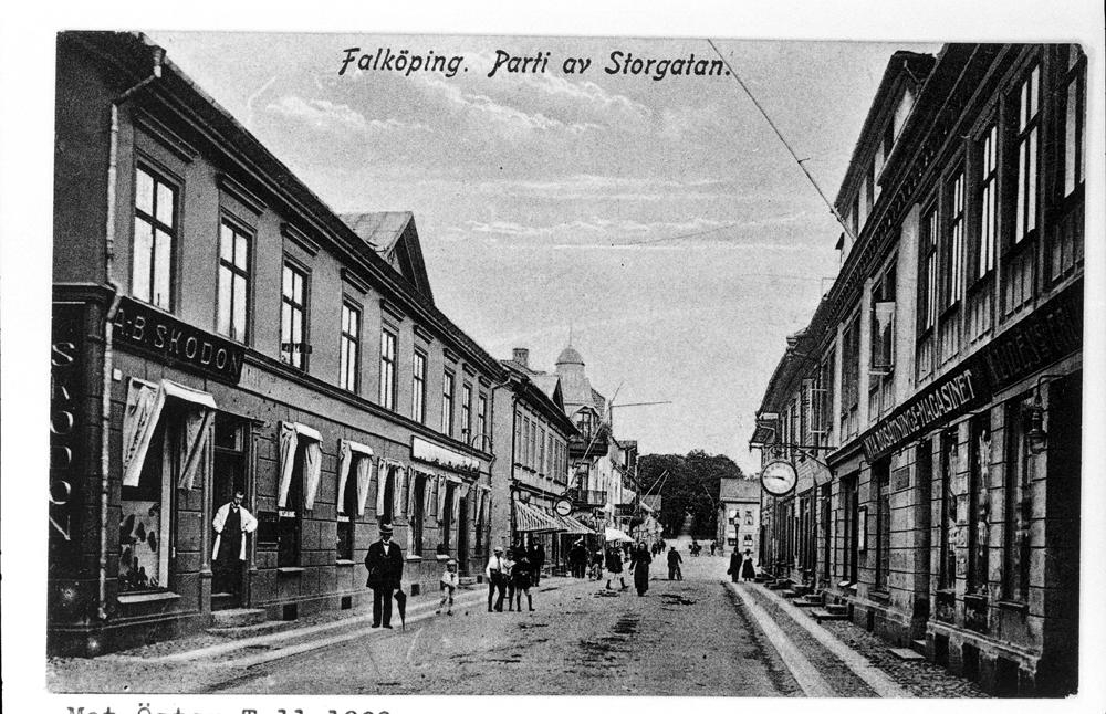 Storgatan. AB Skodon till vänster, Nya Bosättningsaffären till höger.