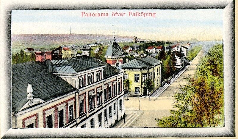 Panorama över Falköping och Mösseberg (färglagt foto). Mellan Apoteket (S:t Olofsgat. 7) och Jungmarkerska huset är det endast planteringar. Här byggde Skaraborgsbanken 1911-13 sitt storslagna bankhus. Byggnadsarbetena tog 1 1/2 år och banken inflyttade i okt. 1913. Byggnaden var, som syns på nedre bilden, större än de flesta husen i staden. Mången ansåg också, att den var för "vräkig". Den byggdes synnerligen stabilt. Exempel härpå är att de då införda luftfunktionerna fungerar ännu (1973). Först 1967 flyttade banken därifrån och då till S:t Olofsgat. 1. Därefter följde inre ombyggn., innan Apoteket flyttade från 7 till 9.