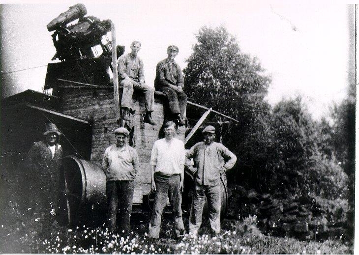 Risholmens mosse. Torvupptagning. Främre raden från vänster: Levin Antonsson (far till Holger och Gustav Antonsson, lagbas och mekaniker), John Karlsson, Holger Antonsson, Erik Andersson. Bakre raden från vänster: Gustav Antonsson och Werner Palmqvist.