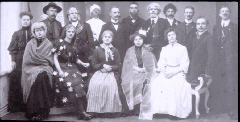 Muntrationsklubben, Falköping. Logen Falbygden. Övre raden: Maja Persson, Knut Larsson, Mårten Jakobsson, skräddare Sven Ahl, Korselli, Erik Hansén, Ivar Lind. Andra raden: Nanny Konradsson, Stina Fahlström, Maja Fahlström, Willy Berggren, Svea Konradsson, Konrad G -son.
