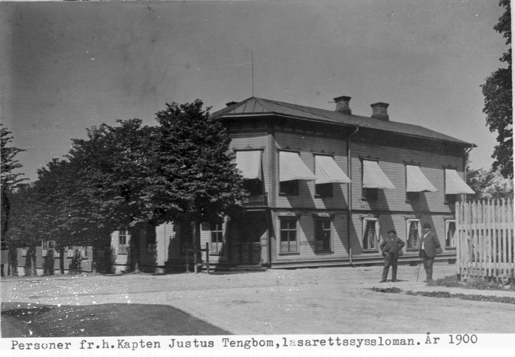 S:t Olofsgatan, Apoteket Kronan. Personer fr.v. veterinär Erik Kylén, mångbetrodd i samhället, kapten Justus Tengbom, lasarettssyssloman.