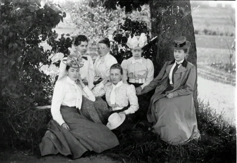 KFUK, Falköping, 1897. Kortet taget vid Lindbloms handelsträdgård. Översta raden från vänster: Ester Ögren, född Nykvist. Hanna Lindblom. Thea Boman. Ingeborg Holmblad, född Haglund. Ester Holmblad. Anna Kilander, född Johansson.