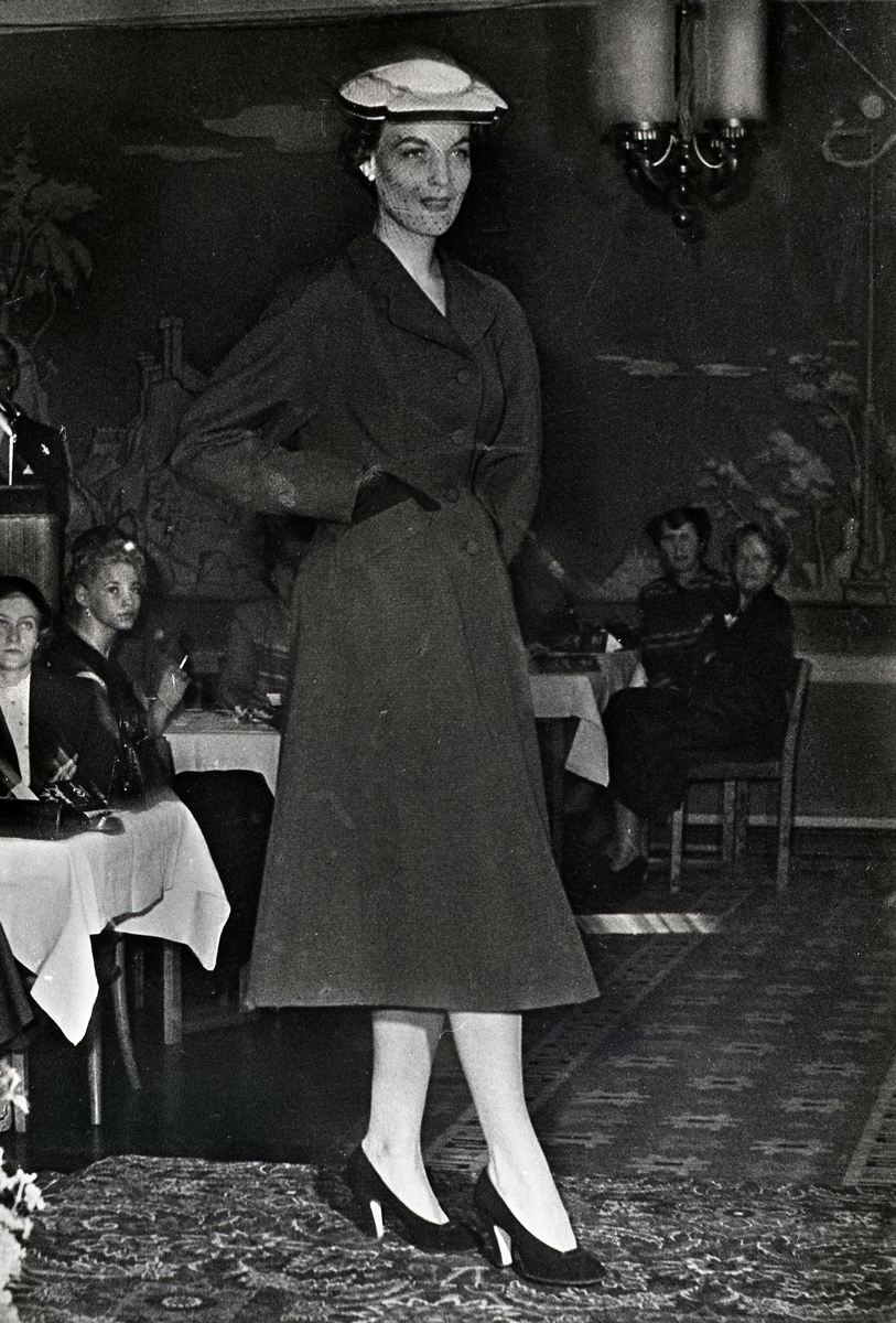 Firma AB N. Ekman. Modekavalkad 1954 i samband med firmans 90-års jubileum. Modevisning Stora hotellet. Bild 3: Kjol och blus våren 1954. Bild 4: Svängd kappa. Skiftande gul och svart bredrandig rips. Våren 1954 Bild 5: Dräkt och kappa årgång 1954. Mellanblå yllerips. Fru Hallgren Bild 6: Eva, Bertil och Marie. Barnbarn till dir. och fru Vilhelm Brandt. Bild 7: Flanschkappa (blåklintsblå). Bild 8: Vårdräkt 1954. Tweed.