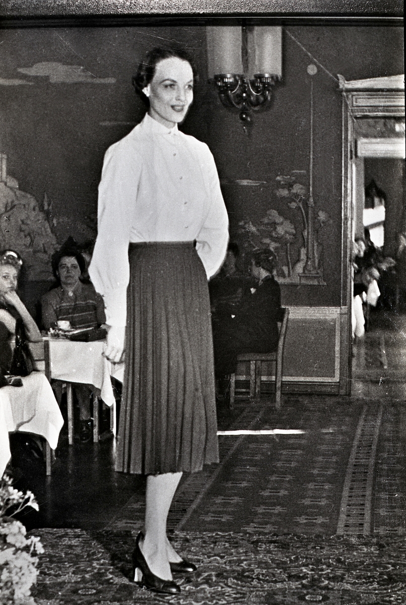Firma AB N. Ekman. Modekavalkad 1954 i samband med firmans 90-års jubileum. Modevisning Stora hotellet. Bild 3: Kjol och blus våren 1954. Bild 4: Svängd kappa. Skiftande gul och svart bredrandig rips. Våren 1954 Bild 5: Dräkt och kappa årgång 1954. Mellanblå yllerips. Fru Hallgren Bild 6: Eva, Bertil och Marie. Barnbarn till dir. och fru Vilhelm Brandt. Bild 7: Flanschkappa (blåklintsblå). Bild 8: Vårdräkt 1954. Tweed.