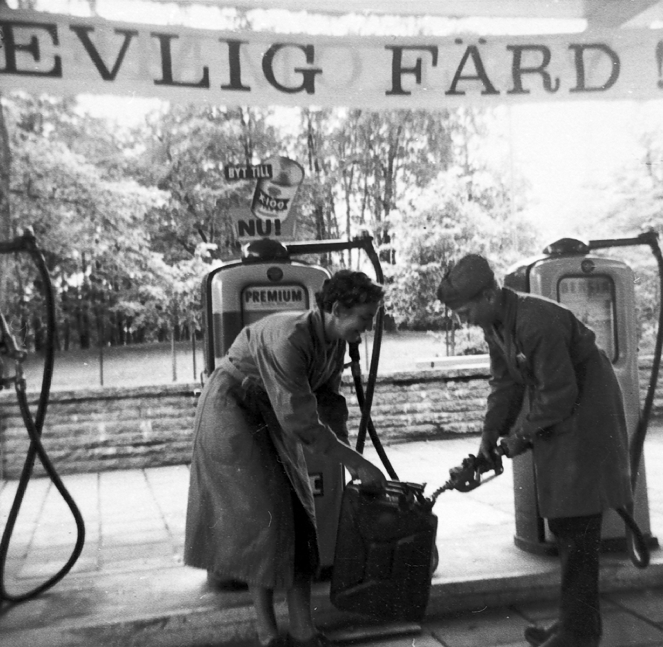 Ingrid och sonen Christer Larsson fyller reservdunken.