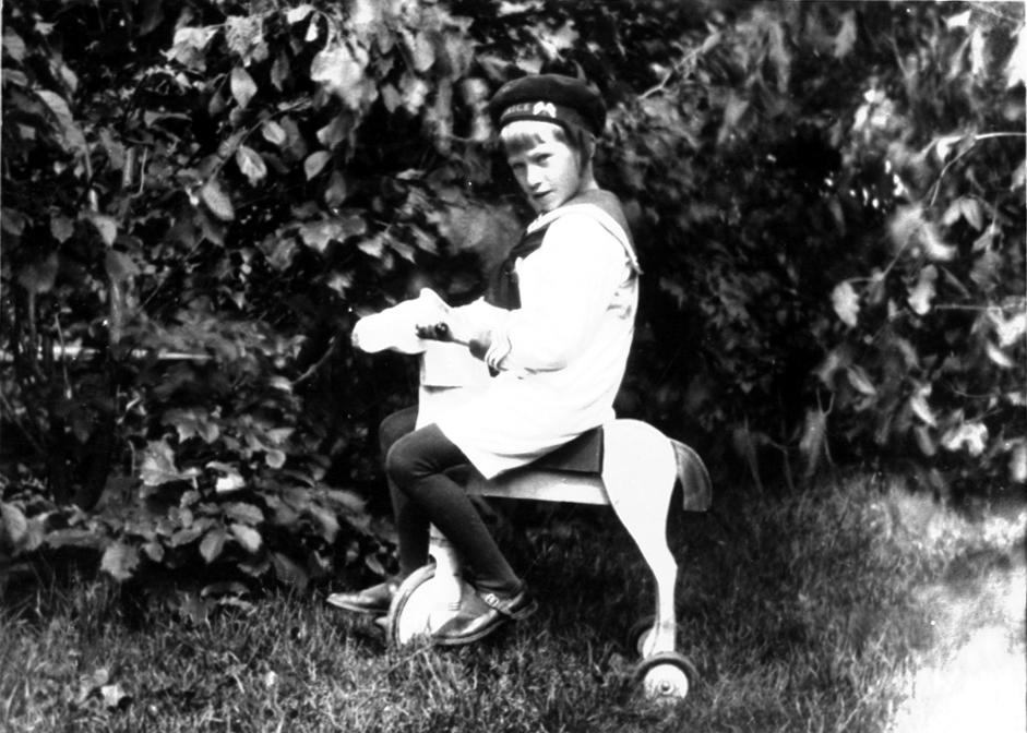 Sven Nyberg på en häst med hjul, hästen gåva till museet.