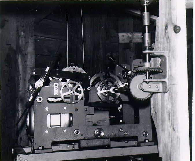 S:t Olofs kyrka. Från byte av tornursverk 1964. Tornursverket i S:t Olofs kyrka. Sidan vindfallat och fördelar hjulen till visartavlorna. Förvaras nu i Falbygdens museum.