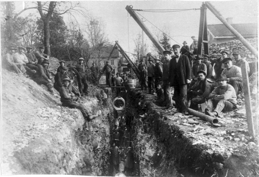 Nedläggning av kloakledning 1921 - 1922. Den aktuella kloaken rann dels mot Hulesjön dels mot Torbjörntorp. Det beslöts att en kloakledning skulle byggas. Arbetet utfördes som nödhjälpsarbete åren 1921-22. Arbetsstyrkan uppgick till mellan 25 och 30 man. De flesta kom från andra orter. Många arbetslösa stenhuggare från Bohuslän deltog liksom gjuteriarbetare från Köpings Mekaniska Verkstad. Den enda "maskinella" utrustning som fanns till hjälp var en stubbrytare och en kran. Diket grävdes 5 meter djupt. Som draghjälp hade man stenkärror och två hästar. Ledningsdragningen gick från undergången vid snickerifabriken - under järnvägen - till Mössebergsgatan - Nils Ericsonsgatan mot Norra undergången.