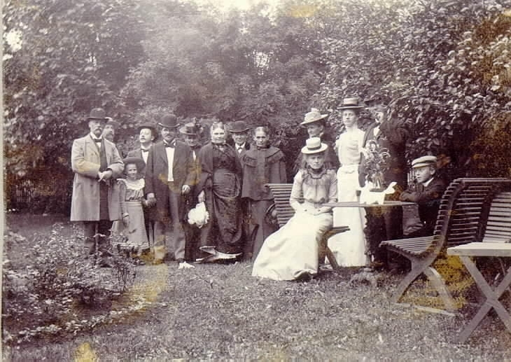 Familjerna Håård, Forss, Lundin, Hallén m.fl. I rådman Håårds trädgård, Trädgårdsgatan 9. Tre av damerna var lärarinnor i Anna Köllerströms flickskola.
