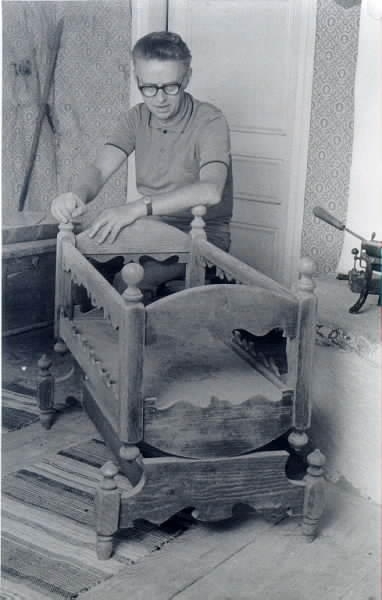 Lennart Larsson vid Georg von Döbelns vagga. Slöt-Idas stuga på Grannabacken Segerstad.