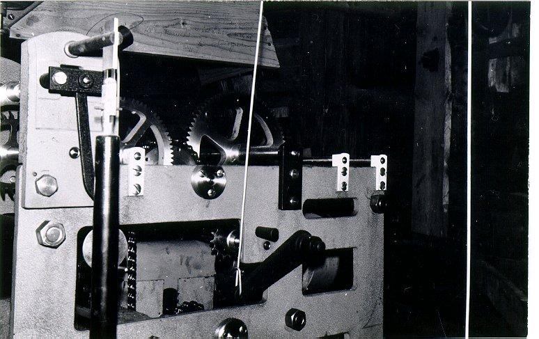 Tornursverket i S:t Olofs kyrka. Pendelupphängning och slagverksarmen med kopplad lina till slaghammaren vid stora klockan. Från byte av tornursverk. Förvaras nu i Falbygdens museum.
