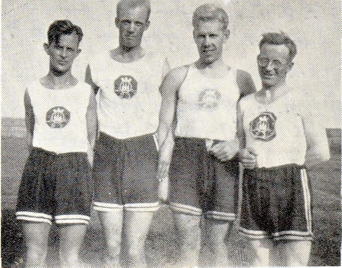Falköpings Gymnastik- och Idrottssällskap. F.G.I.S. segrande lag i stafett 4 x 400 M. i D.G. 1930. Från vänster: Hans Mörk, Arnold Mansfield, Lars Hagberg och Sven Mörk.