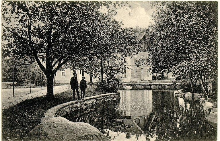 Mössebergsparken, svandammen och villa nr 1 i bakgrunden.
