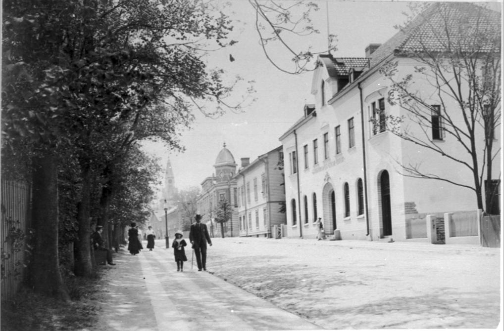 Skaraborgs Enskilda bank. Apoteket och kyrkan i bakgrunden.