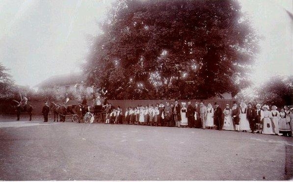 Planteringsförbundets första sommarfest. Bröllopståget. Medverkande i detta: Stadens mest kända personligheter. Deltagare i bröllopståget från vänster till höger: Stående vid vagnen: festarrangören A.D. Andersson (Ade) 1:e stationsskr. Vid SJ. Brudgummen: Carl Lagergren, stationsskr. vid SJ. Bruden: prof. och generaldir. Ivar Tengbom, Spelmän: Banktjänsteman Hjalmar Lundin och kontorist Arvid Jakobson. Prästen: Ernst Edström, stationsskr. vid SJ. Prostinna: frk Hulda Hennerberg. Frk Ruth Bergqvist, disp. Oskar Nilsson, bryggeriet Victoria, frk Anna Rehn, gift Elgh, Länsman: Sigurd Johansson, manufakturhandl., obekant dam, Nils Johansson, specerihandl., frk Josefine Jonasson, gift Settergren, Borås, Paul Elgh, handelsresande, obekant dam, Hjalmar Lundbladh, kassör bryggeriet Victoria, frk Hildur Pettersson-Nyborg, Karl Janzon, ing. frk Ellen Uggla, gift Johansson, frk Nanny Janzon, gift Tegnér, frk Hilma Eriksson, gift Forsberg, frk Elin Jakobson, gift Erlandsson, frk Sigrid Jakobson, gift Lundin, frk Edith Andersson.