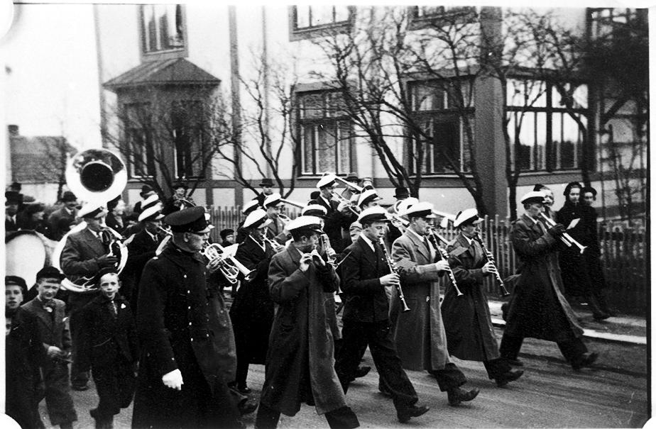 Mössebergs musikkår 1 maj omkr. 1940, Torstenssonsgatan.