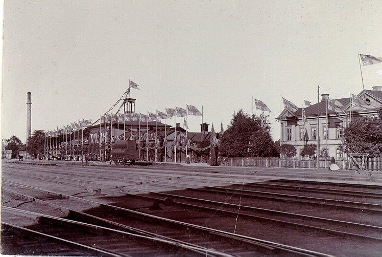 Falköping-Rantens järnvägsstation prydd till kung Oscars ankomst.