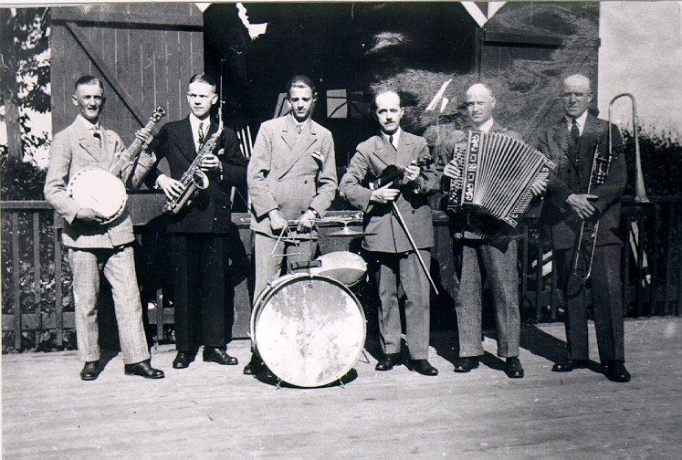 Dansband. Zeldéns orkester Skaraborgs regementes dansbana 1925. Alvar "Putte" Sandberg banjo, Johannes Andersson saxofon, Gösta Zeldén trummor, son till Zeldén, Zeldén fiol, Karl Westberg dragspel, Mårten Lundin trombon.