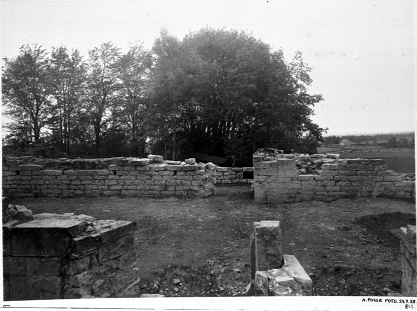 Mittkoret sett från södra koret. I fonden mittkorets norra mur med ställningshål och ingång till norra koret. I förgrunden mittkorets södra mur. Sten nr. 100 inpassad i sitt ursprungsläge.
