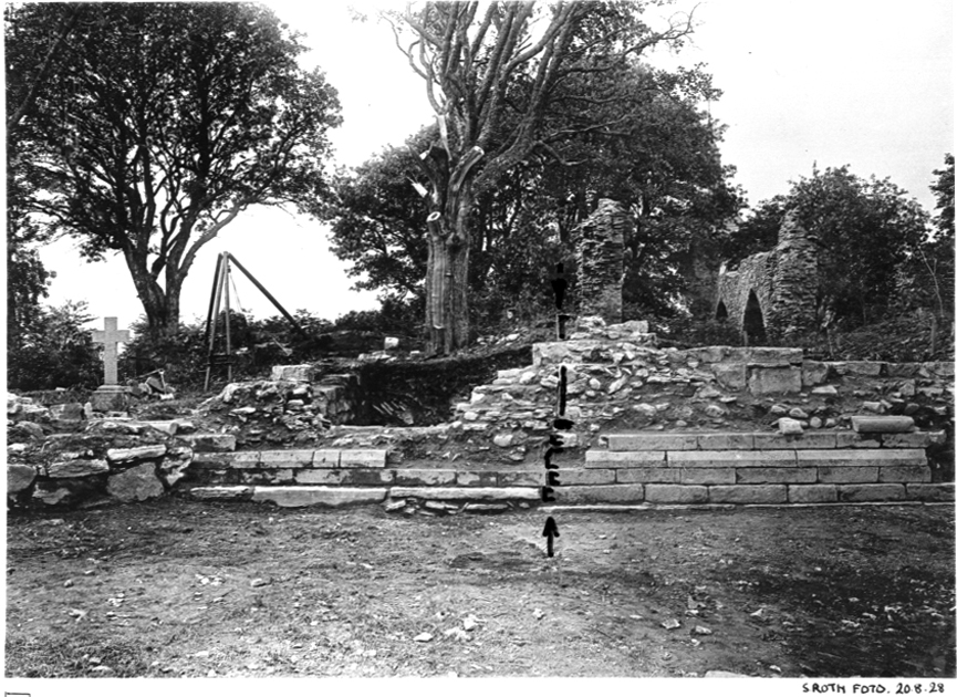 Södra delen av klosterkyrkans östmur från öster. Förbindelsemuren med östra huset. Sydkoret. Skarv. Mittkoret.