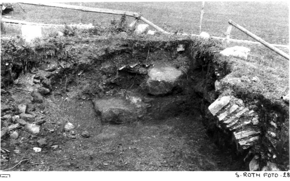 Östra huset. Nordöstra inre hörnet med härden från söder.