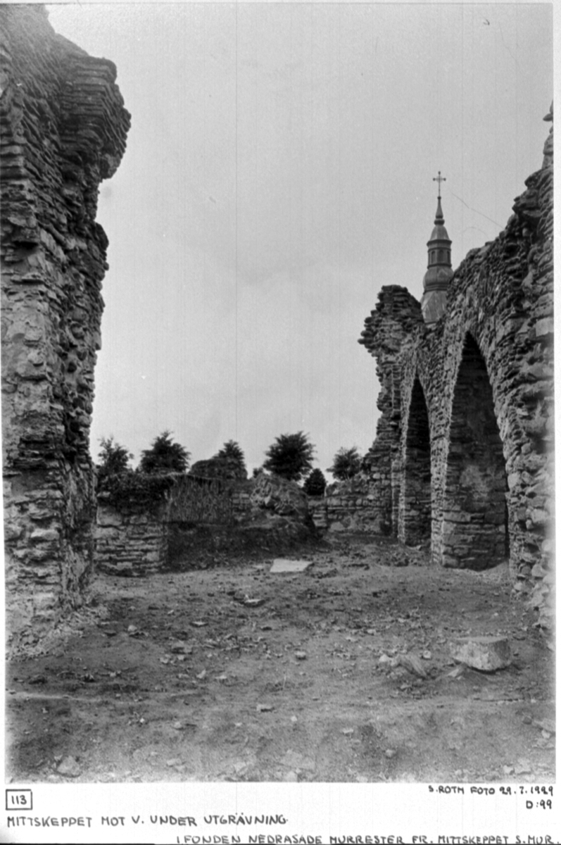 Mittskeppet mot väster under utgrävning. I fonden nedrasade murrester från mittskeppets södra mur.