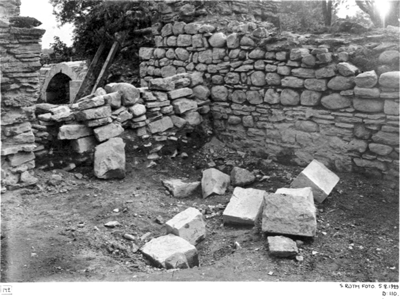 Provisorisk mur i södra sidoskeppets östligaste del från nordost. T.v. bakom muren i bågnischen i södra koret och den nerrasade murklumpen i södra tvärskeppets norra del.