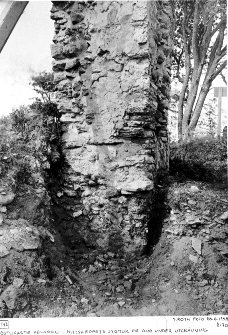 Östligaste pelaren i mittskeppets sydmur från ostnordost under utgrävning.