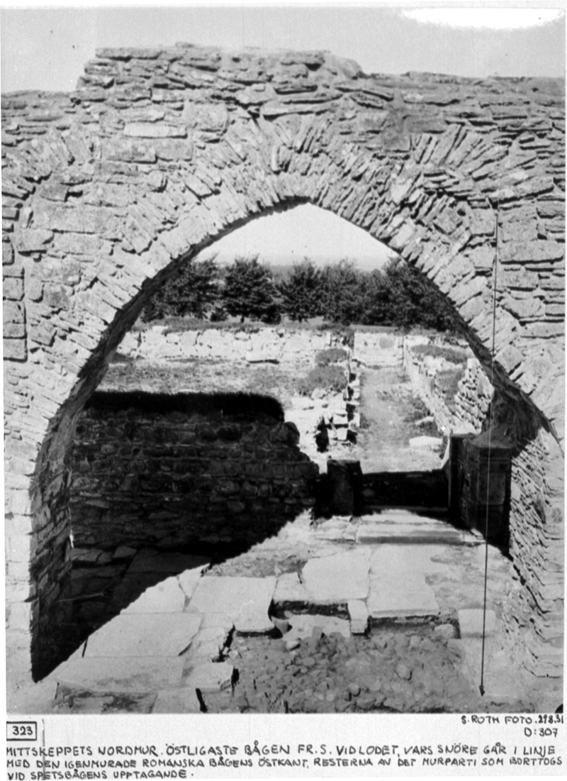 Mittskeppets nordmur. Östligaste bågen från söder. Vid lodet, vars snöre går i linje med den igenmurade romanska bågens östkant, resterna av det murparti som borttogs vid spetsbågens upptagande.