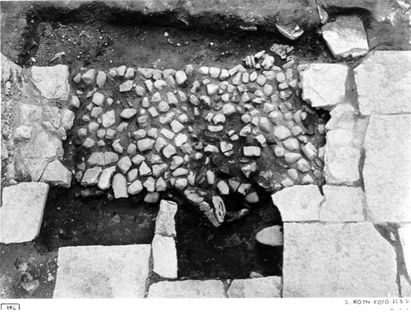 Partiet mellan pelarena i den östligaste bågen i mittskeppets nordmur från söder och norr. På undergrunden rester av pelaren mellan de östligaste, sedermera igenmurade romanska bågarna.