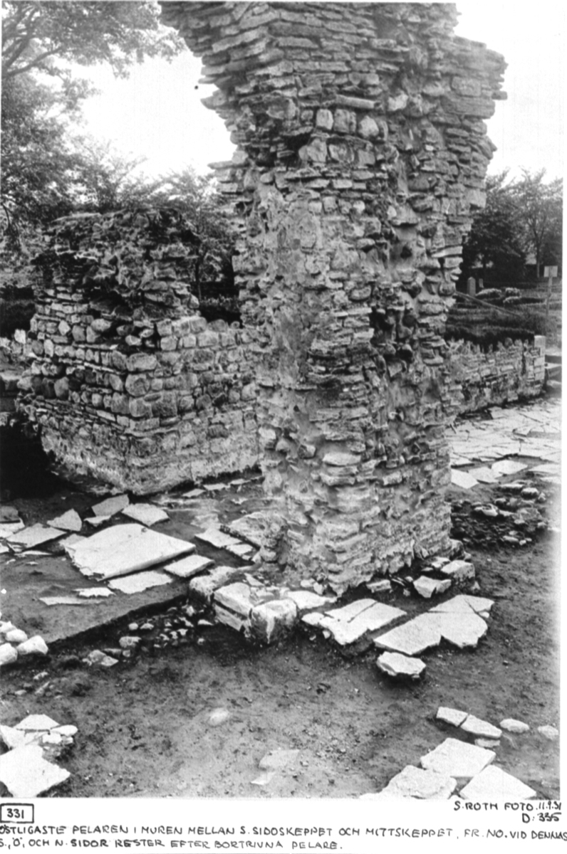 Östligaste pelaren i muren mellan södra sidoskeppet och mittskeppet. Från nordost. Vid dennas östra och norra sidor rester efter bortrivna pelare.
