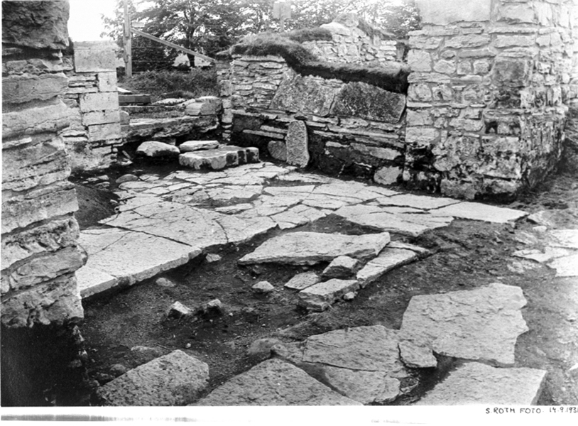 Mellersta bågöppningen i muren mellan mittskeppet och södra sidoskeppet från nordost. Rester av pelare.