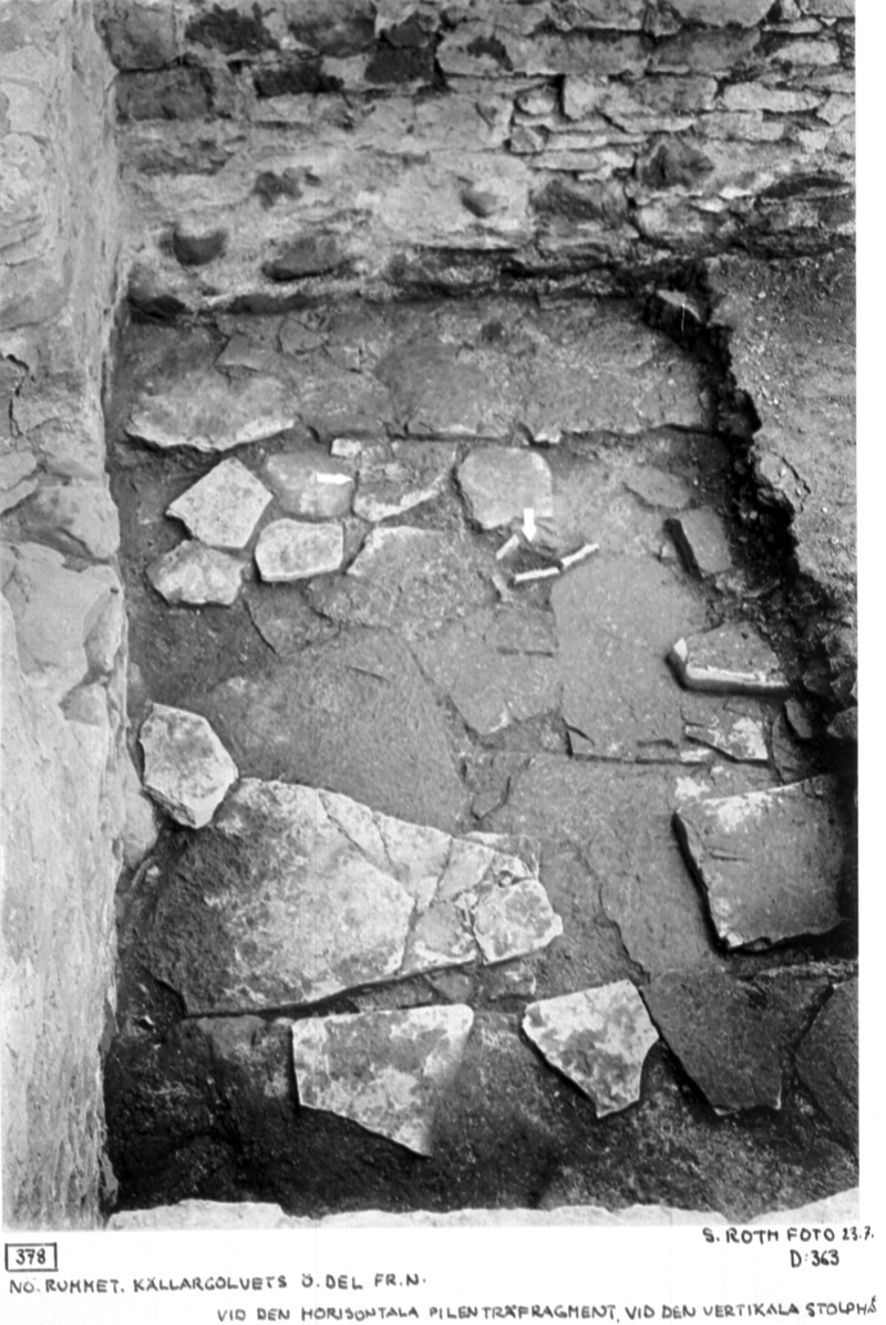 Nordöstrummet. Källargolvets östra del från norr. Vid den horisontala pilen träfragment, vid den vertikala stolphål.
