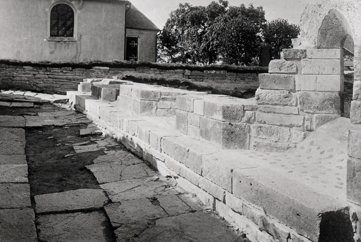 Södra korsgången. muren konserverad. Före asfalteringen, från sydost.