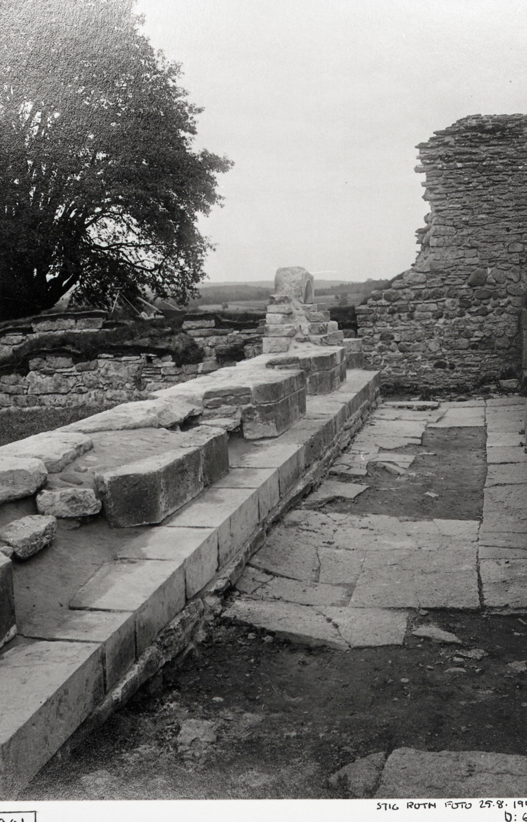 Södra korsgången. Norra muren konserverad före asfalteringen från sydväst.