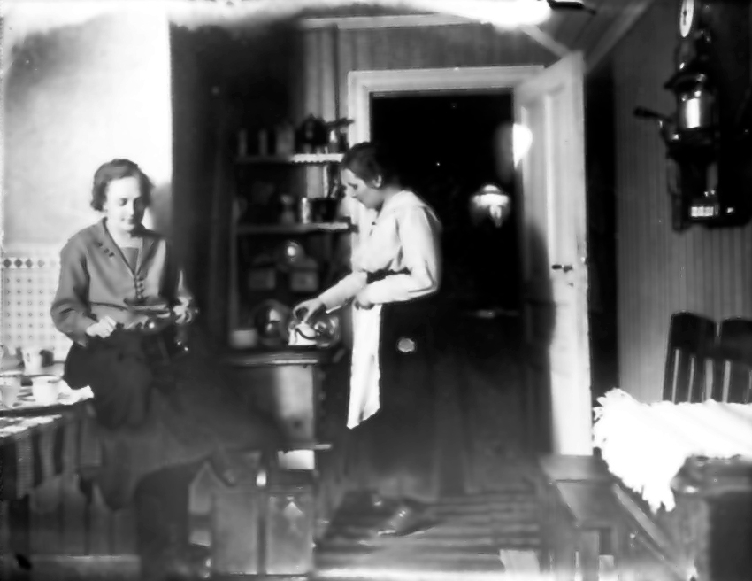 Floby gamla kyrkskola, köket. Fröken Naemi Jönsson och fru Elsa Jörgensson.