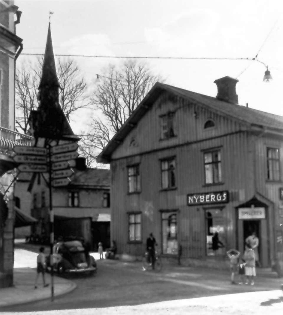 "Vid Nybergs - stängningsdags" (Storgatan - S:t Olofsgatan). Från utställningen "Falköping i bild" 1952.