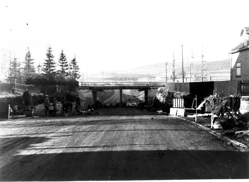 Byggnadsarbete pågår med viadukten. Vägport och väganläggning avsynad 8 febr. 1939. Den nya utfartsleden delar sig vid Danska Vägen med en väg åt Göteborg och en del norrut. Mössebergs långsträckta kontur i bakgrunden.